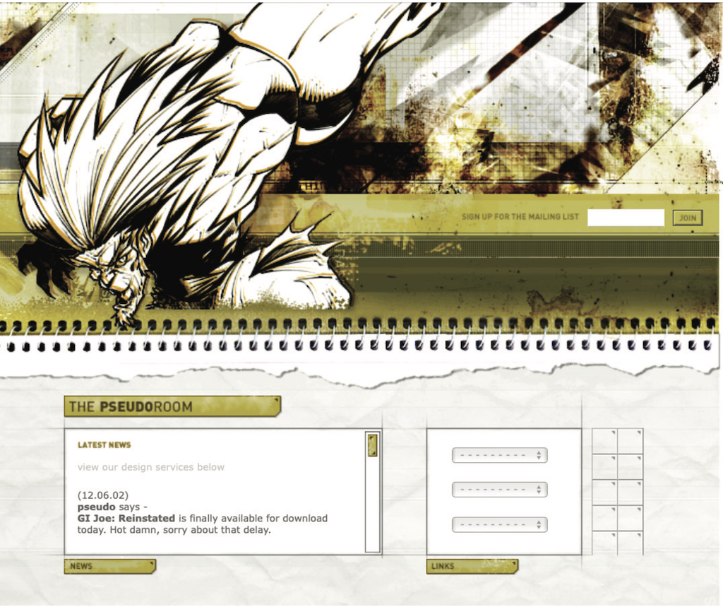 For example, this iteration of my personal portfolio site (“the pseudoroom”) from that era was experimental, if not a bit heavy- handed, in the visual communication of the concept of a living sketchbook. Very skeuomorphic. I collaborated with fellow designer and dear friend Marc Clancy (now a co-founder of the creative project organizing app Milanote) on this one, where we’d first sketch and then pass a Photoshop file back and forth to trick things out and play with varied user interactions. Then, I’d break it down and code it into a digital layout.